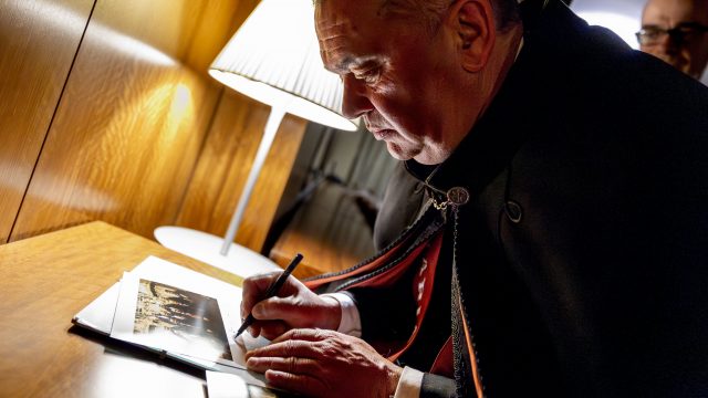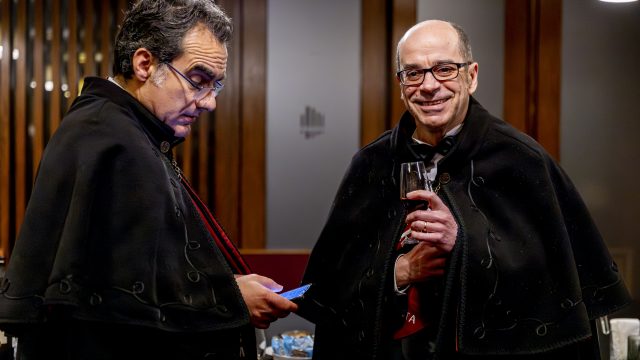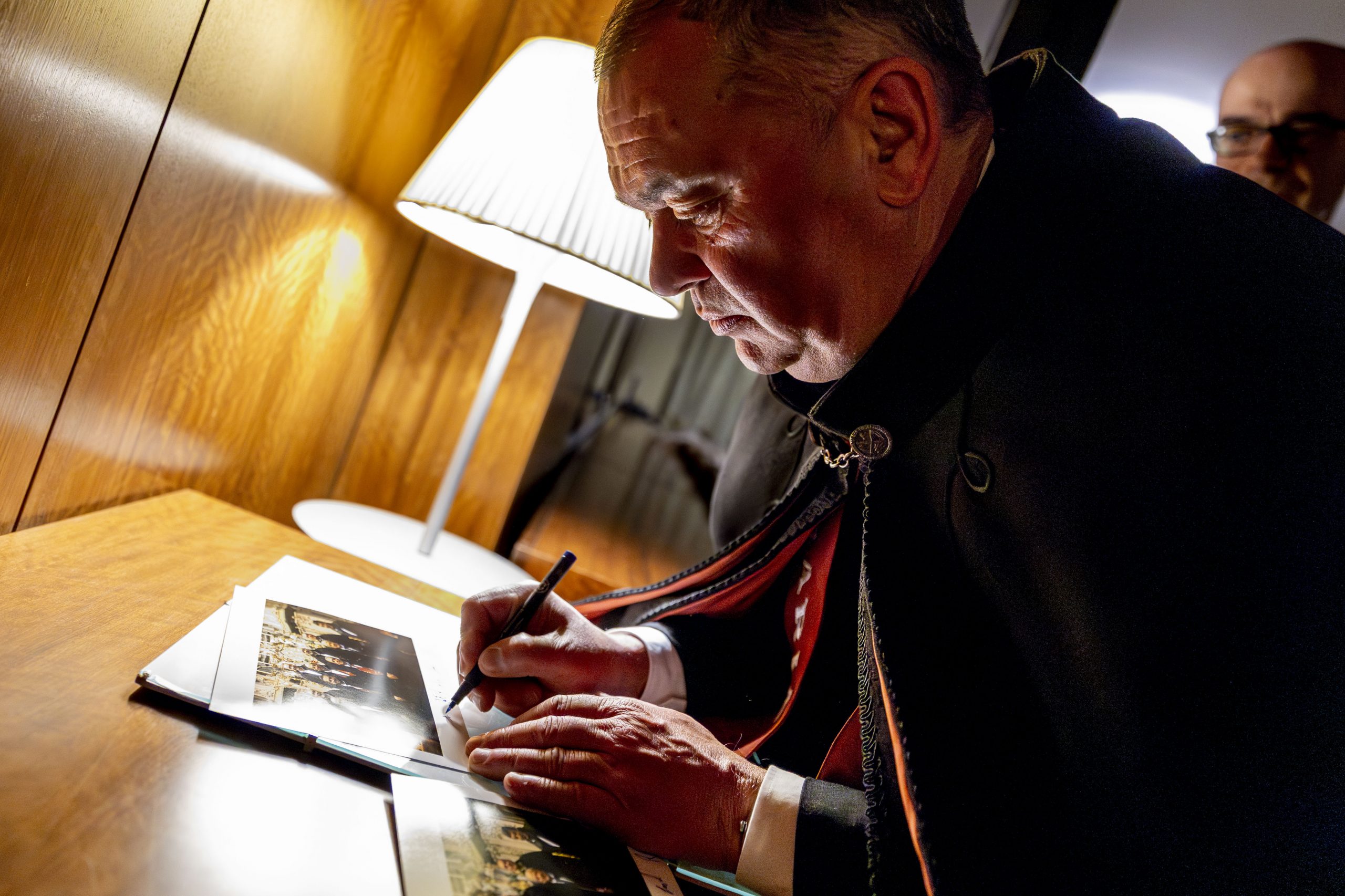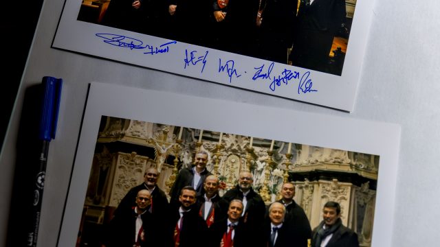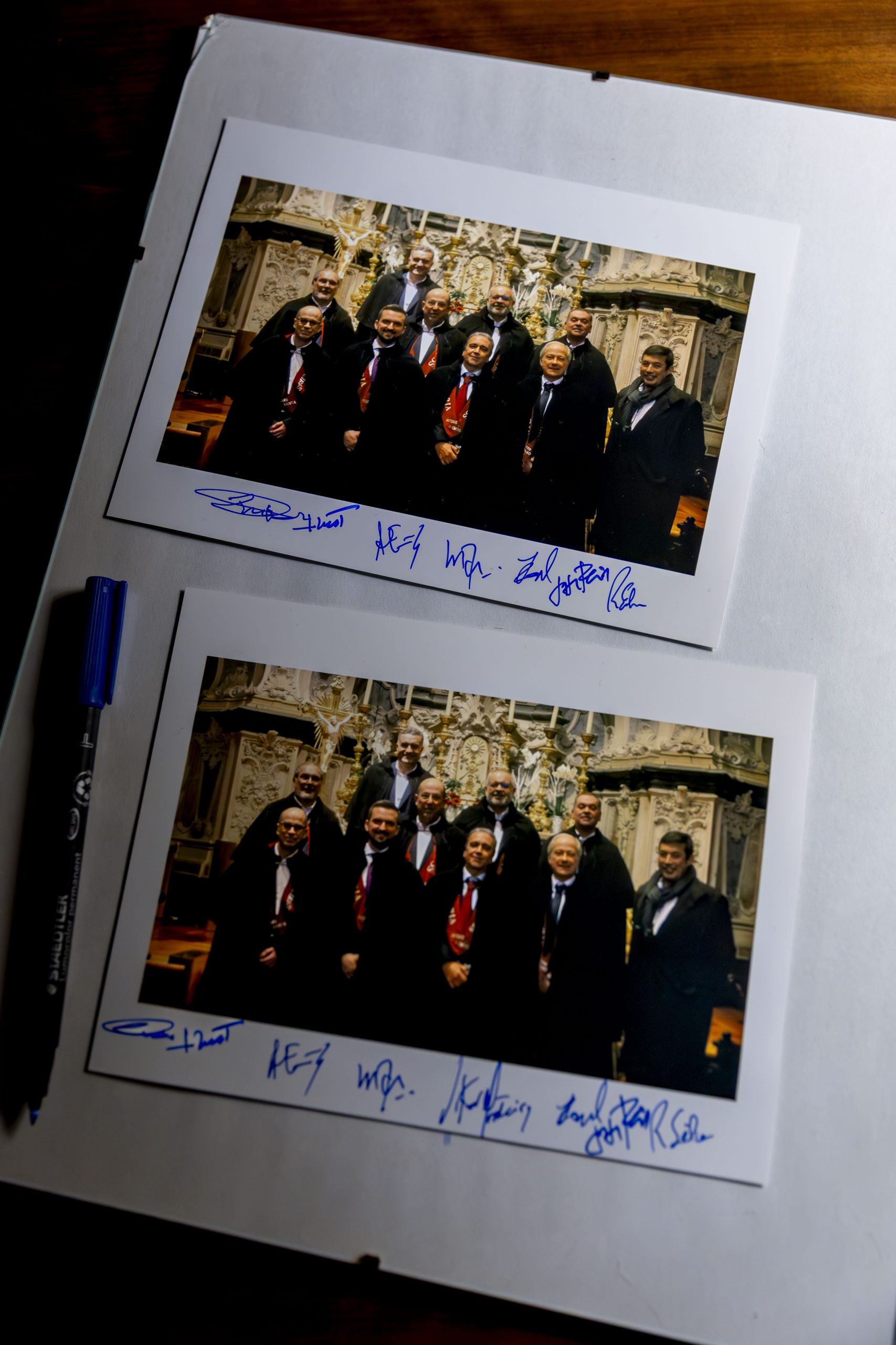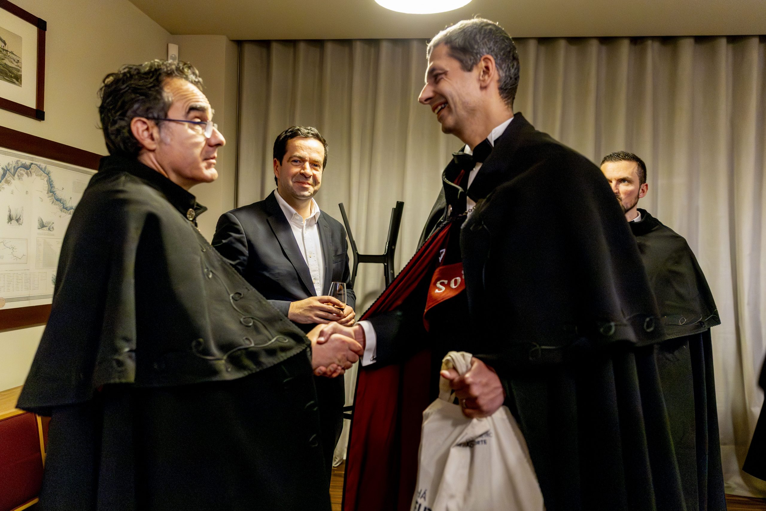 Durante a visita à OERN, os membros da Confraria envergaram os tradicionais smokings e as solenes faixas cor de tijolo, bordadas à mão, símbolo distintivo da irmandade.